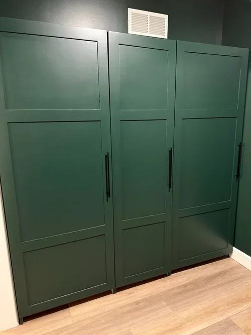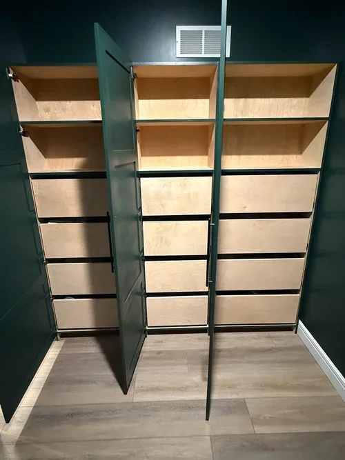 We designed and built this full-height cabinetry with hanging space, shelving, and drawers, then finished the cabinets to match the existing wall color for a seamless look.