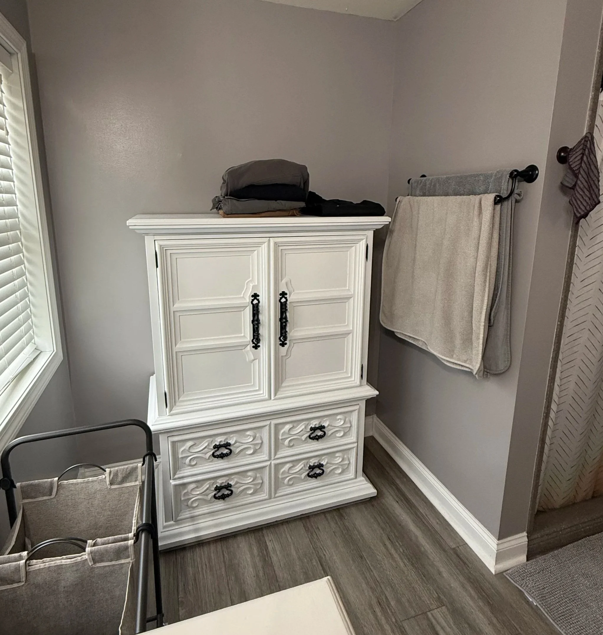This area originally had a standalone piece that did not fully utilize the space or provide efficient storage. The homeowner wanted a better fit with a finish that matched the existing vanity.